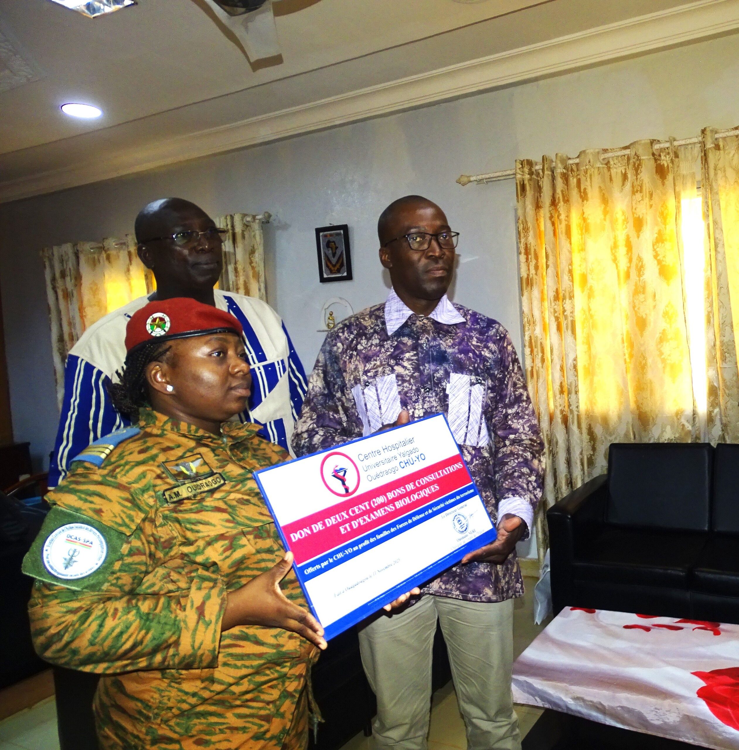 (Ouagadougou, le mercredi 12 novembre 2025/ CHU-YO) Le directeur général du centre hospitalier universitaire Yalgado Ouédraogo, Ousmane Néré, a offert 200 bons de consultations et d’examens biologiques à Mme Arlette Mathilde Ouédraogo, la directrice centrale de l’action sociale et des services psychologiques des armées. Chaque bon a une valeur de 15.000FCFA. Les bénéficiaires sont les familles des éléments des FDS tombés au champ d’honneur pour la défense de la patrie.